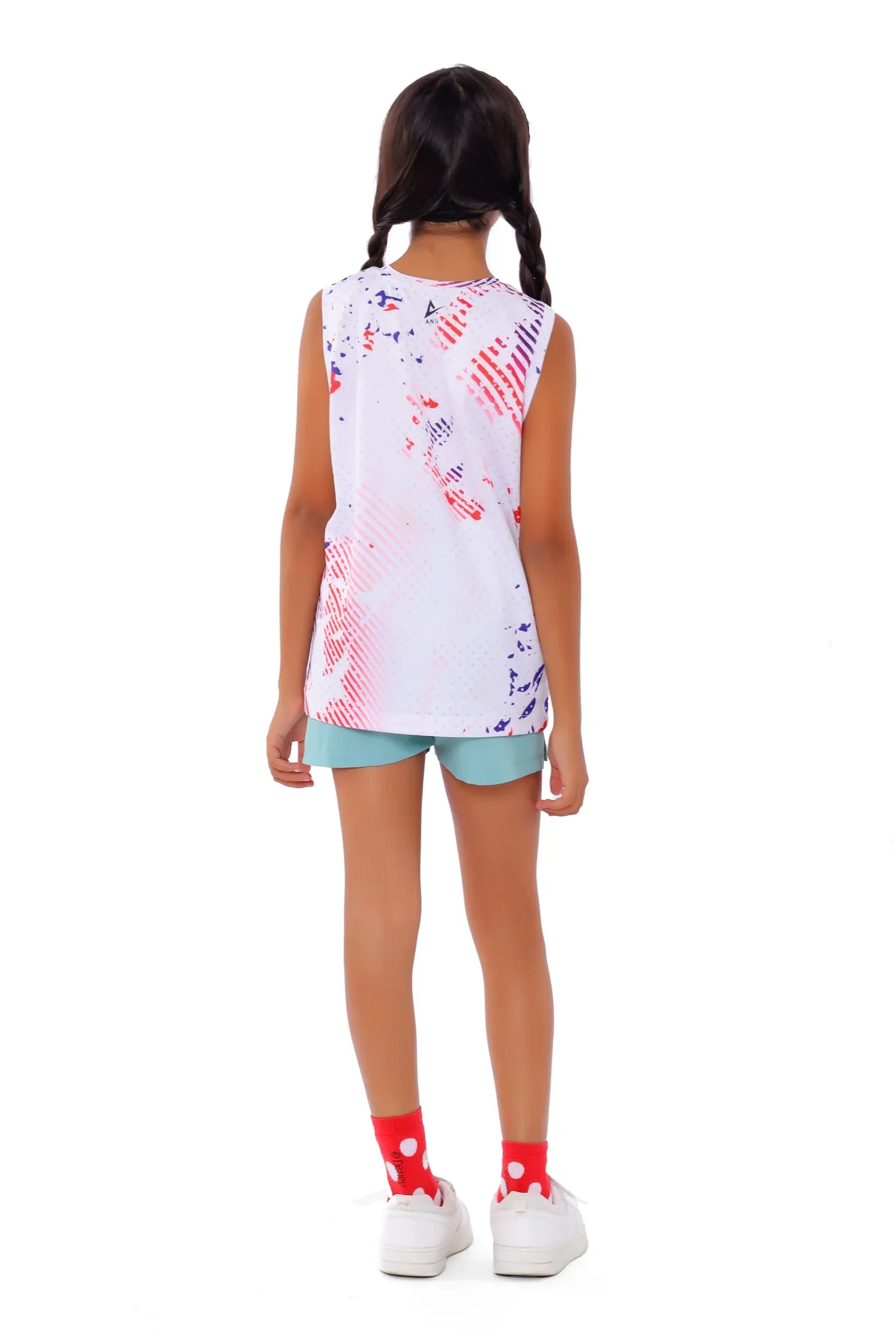 تي شيرت رياضي بدون أكمام بطبعة رذاذ الطلاء الأبيض للبنات