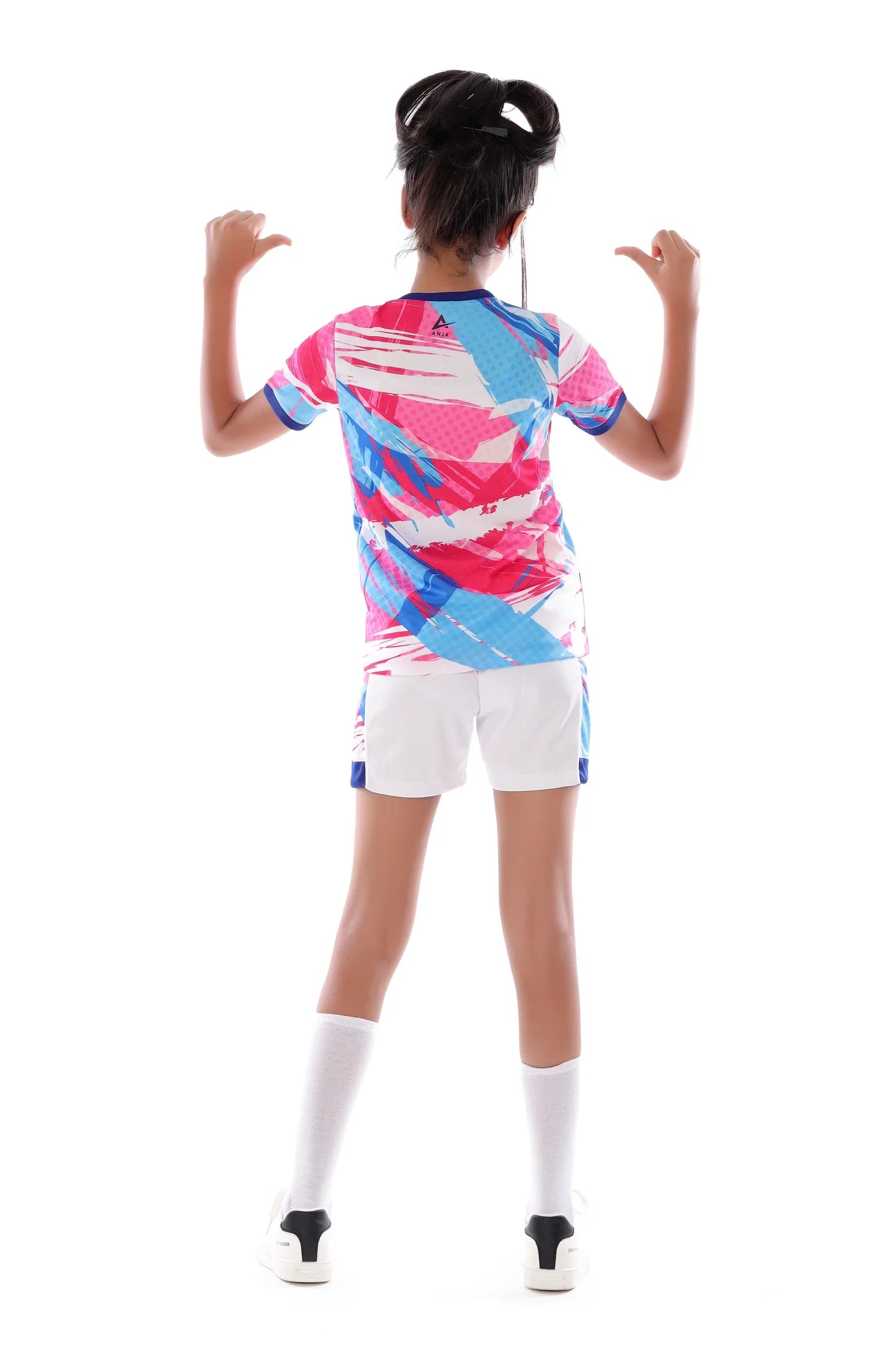 طقم رياضي جرافيكي للبنات باللونين الوردي والأزرق - طقم تي شيرت وشورت رياضي