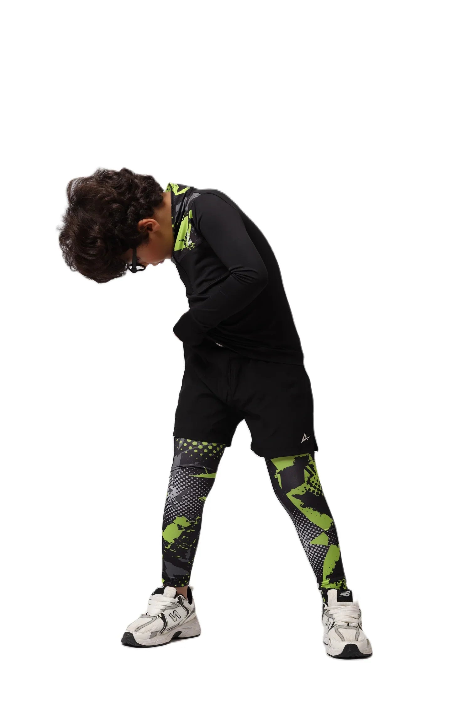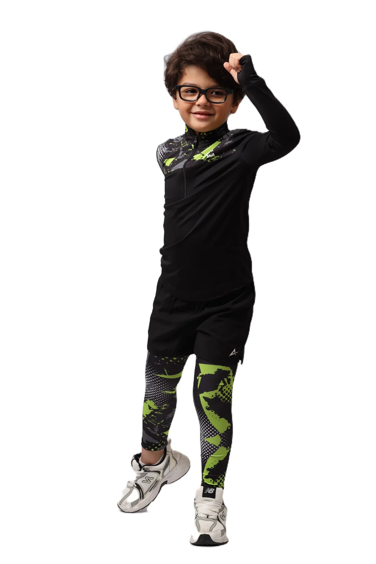 تي شيرت للأولاد بنقشة سوداء وأخضر - بلوزة رياضية بأكمام طويلة